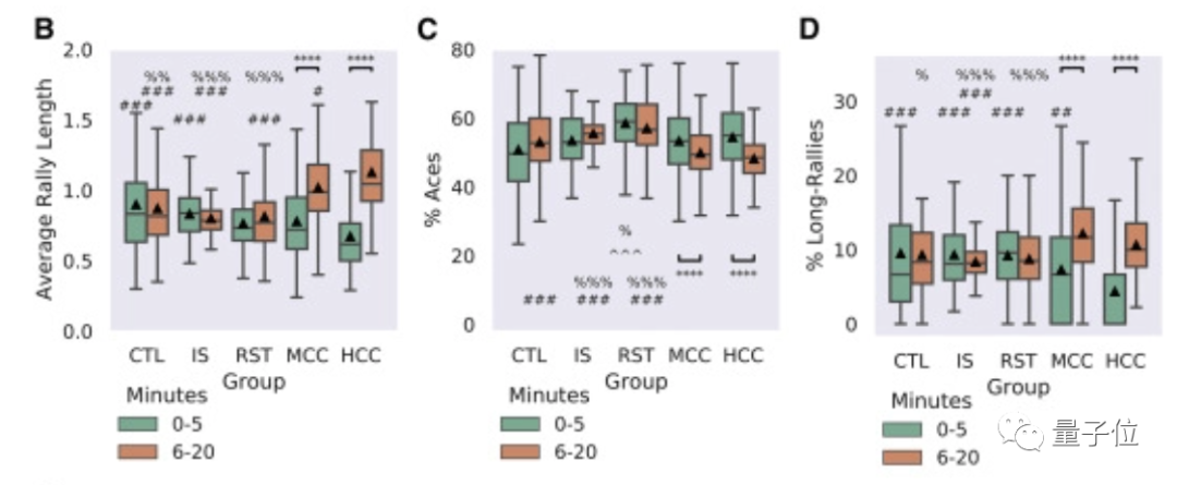 但在6秒到20秒区间内,两个实验样本表现明显超过了对照组,有更好表现,此外首次发球(ACE)没接到的比率也有所降低,而对照组几乎没有变化: