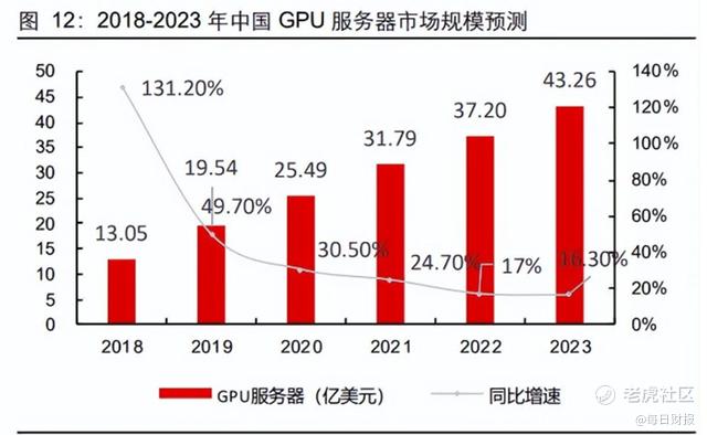 据 IDC 数据显示,2018 年全年中国 GPU 服务器市场规 模约为 13.05 亿美金(约合人民币 90.05 亿元),同比增长 131.2%。同时 IDC预测, 到2023 年中国 GPU 服务器市场规模将达到 43.2亿美金(约合人民币300亿元),未 来 5 年整体市场年复合增长率(CAGR)为 27.1%。因此,相关公司均有较大发展空间。(每财网出品)