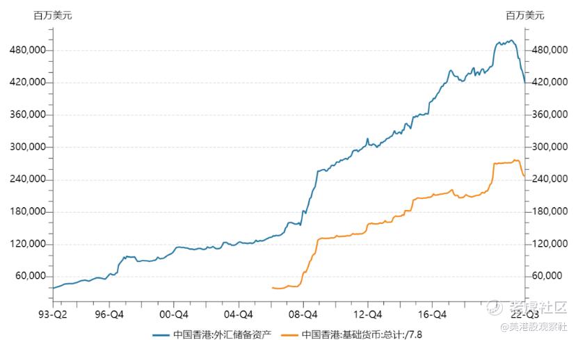 为了保障充裕的调控能力,香港维持了大量的外汇储备,要大幅高于基础货币的数量,拿最新的数据来看,今年9月底香港的外汇储备资产为4192亿美元,而同期的基础货币还不到2500亿美元。我们也可以看到,今年以来,随着美元升值,香港市场也面临资本外流的风险,港币贬值压力大,香港为此花费了大量的外汇储备来维持汇率稳定,外汇储备从将近5000亿美元下降到了4192亿美元。