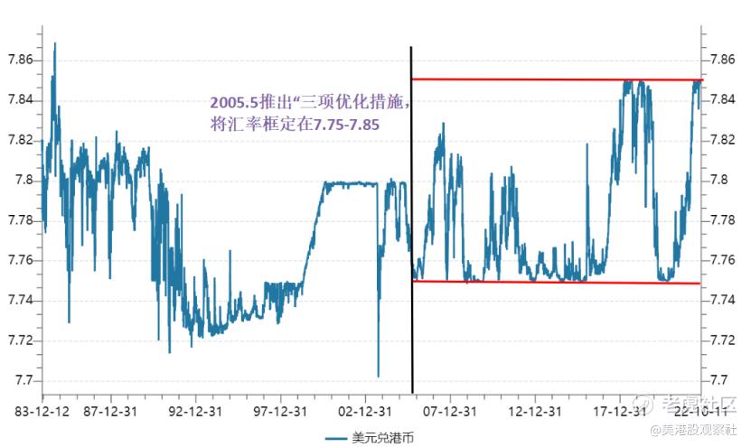 相反,在1983年实施联系汇率制度以来,港元汇率在面对外来震荡时依然保持稳定,期间经历了1987年股灾、1990年波斯湾战争、1992年欧洲汇率机制危机、1994至95年墨西哥货币危机,还有1997至98年亚洲金融危机,联系汇率的抗打击能力一直杠杠的,尤其是2005年改革之后,香港的汇率更是被框定在了7.75到7.85之间。