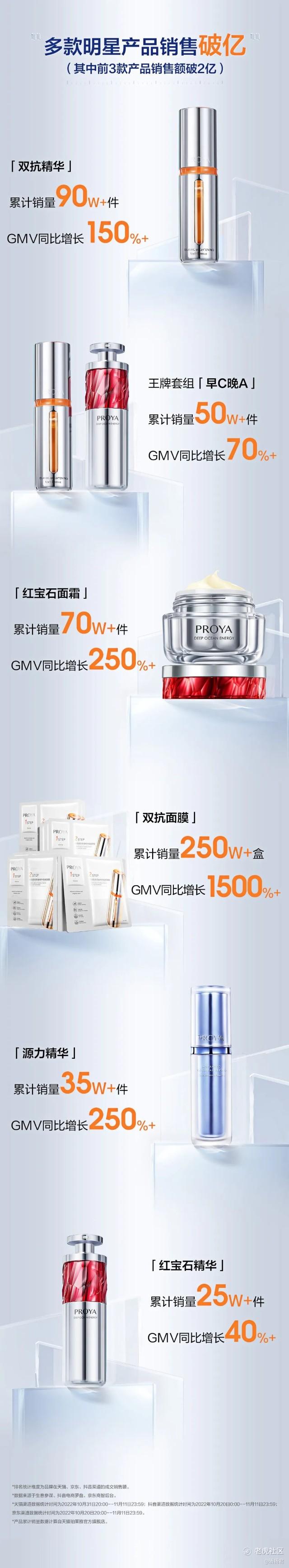 双11期间,珀莱雅多款产品成交金额破亿元。其中,双抗精华累计销售90万+件,GMV同比增长150+%,GMV破3亿元;王牌套装「早C晚A」销售50万+件,GMV 同比增长70%+,GMV破3亿元;红宝石面霜累计销售70万+件,GMV同比增长250+%;双抗面膜累计销售250万+件,GMV同比增长1500+%;原力精华累计销售35万+件,GMV同比增长250+%;红宝石精华累计销售25万+件,GMV同比增长40+%。