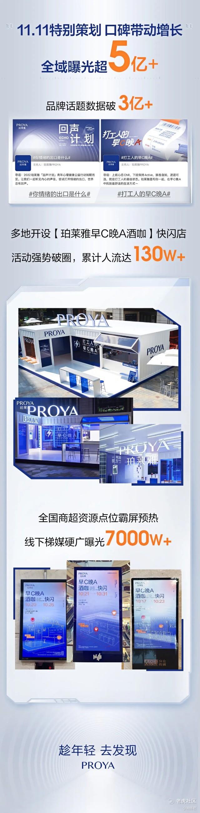 10月21日-11月10日,珀莱雅线下酒咖快闪店活动在全国分阶段开启,累计人流量达130万+;全国商超资源点位霸屏预热,线下梯媒硬广曝光7000万+;“你的情绪出口是什么”和“打工人的早C晚A”话题数据破3亿+。从护肤方式到早咖夜酒的生活模式,早C晚A逐渐演变成打工人的一种“45°”的生活状态。∠45意味着进退可选,∠45意味着随时需要在消耗与蓄能中保持平衡。