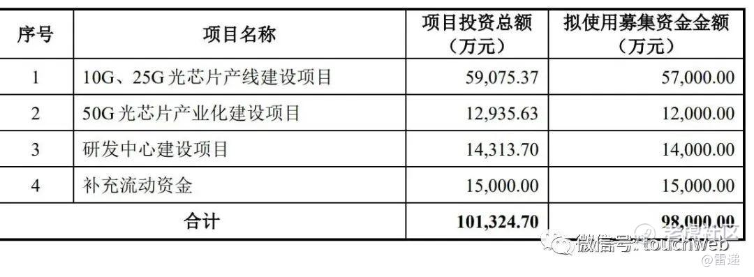 源杰半导体计划募资9.8亿元,其中,5.7亿元用于10G、25G光芯片产线建设项目,1.2亿元用于50G光芯片产业化建设项目,1.4亿元用于研发中心建设项目,1.5亿元用于补充流动资金。