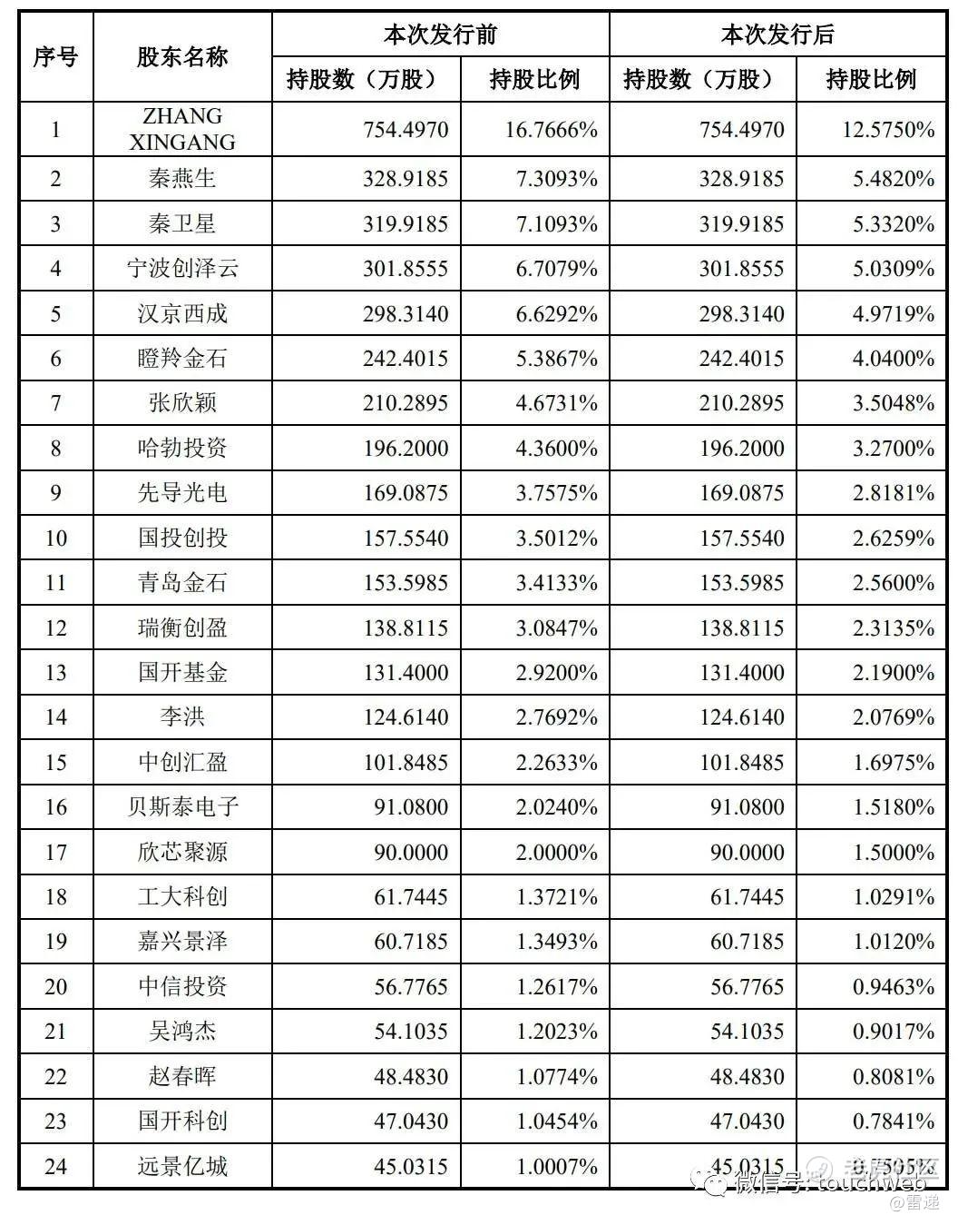 IPO后,ZHANG XINGANG持股为12.575%,秦燕生持股为5.4820%,秦卫星持股为5.3320%,宁波创泽云持股为5.0309%,汉京西成持股4.9719%,瞪羚金石持股4.04%,张欣颖持股3.5048%;