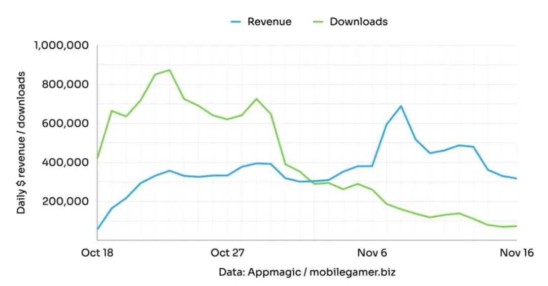从平台划分来看,iOS和安卓分别为该游戏贡献了638万美元收入和457万美元收入,目前Google Play平台的下载量更高,达到867万次,而iOS下载量只有353万次。
