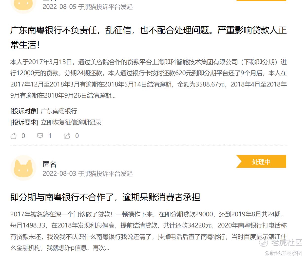 而即科集团与南粤银行的合作已于2018年结束,但双方的纠纷仍在持续。目前黑猫投诉上针对南粤银行的投诉为80个,但大部分指向即分期美容贷。大量借款人投诉称,在还清借款后,征信记录仍有逾期呆账,南粤银行还在电话催收,且“两家公司互相踢皮球,说是对方过失导致征信出现逾期记录”。