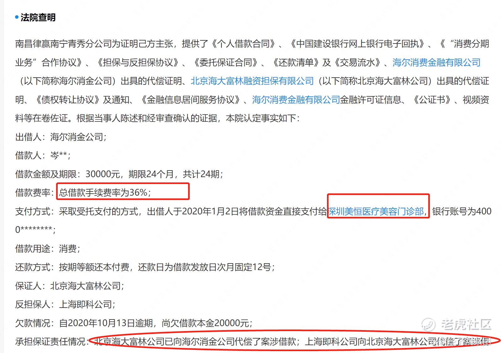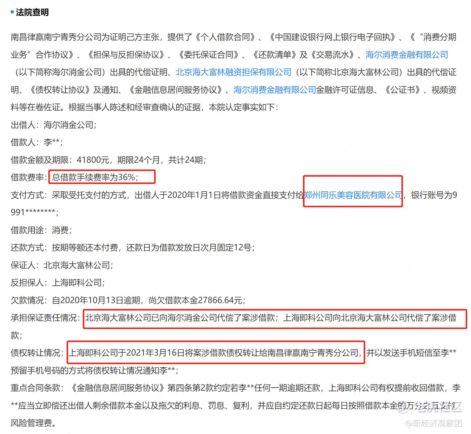 其中,南昌律赢企业管理有限公司南宁青秀分公司为被告的数十个追偿权纠纷民事判决书中,显示借款人费率均为36%,并涉及海尔消金、北京海大富林融资担保有限公司、美容院和即科集团。
