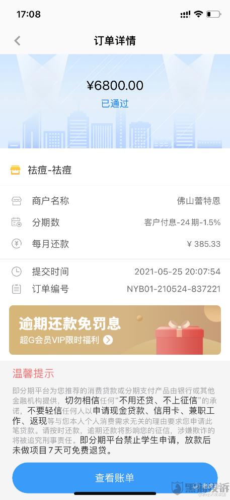 一名大学生用户称,2021年5月22日,在去“蕾特恩专业祛痘”做护理的过程中,在不知情下被下载了即分期,诱导贷款了6800元,分24期,共要还9247.92元。而在借款页面之下,即分期明确写着“禁止学生申请”。