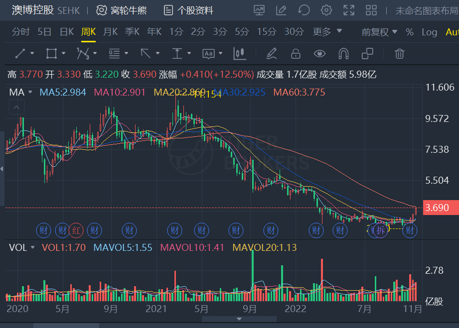 近期,随着开放的预期逐渐升温,二十条优化措施的发布,更是让港股疯涨,直接被各方媒体高歌港股已经进入了技术性牛市。而对开放消息尤为敏感的博彩股,更是一改10月份跌到扑街的态势,自10月31日以来,股价每天都在突飞猛进。