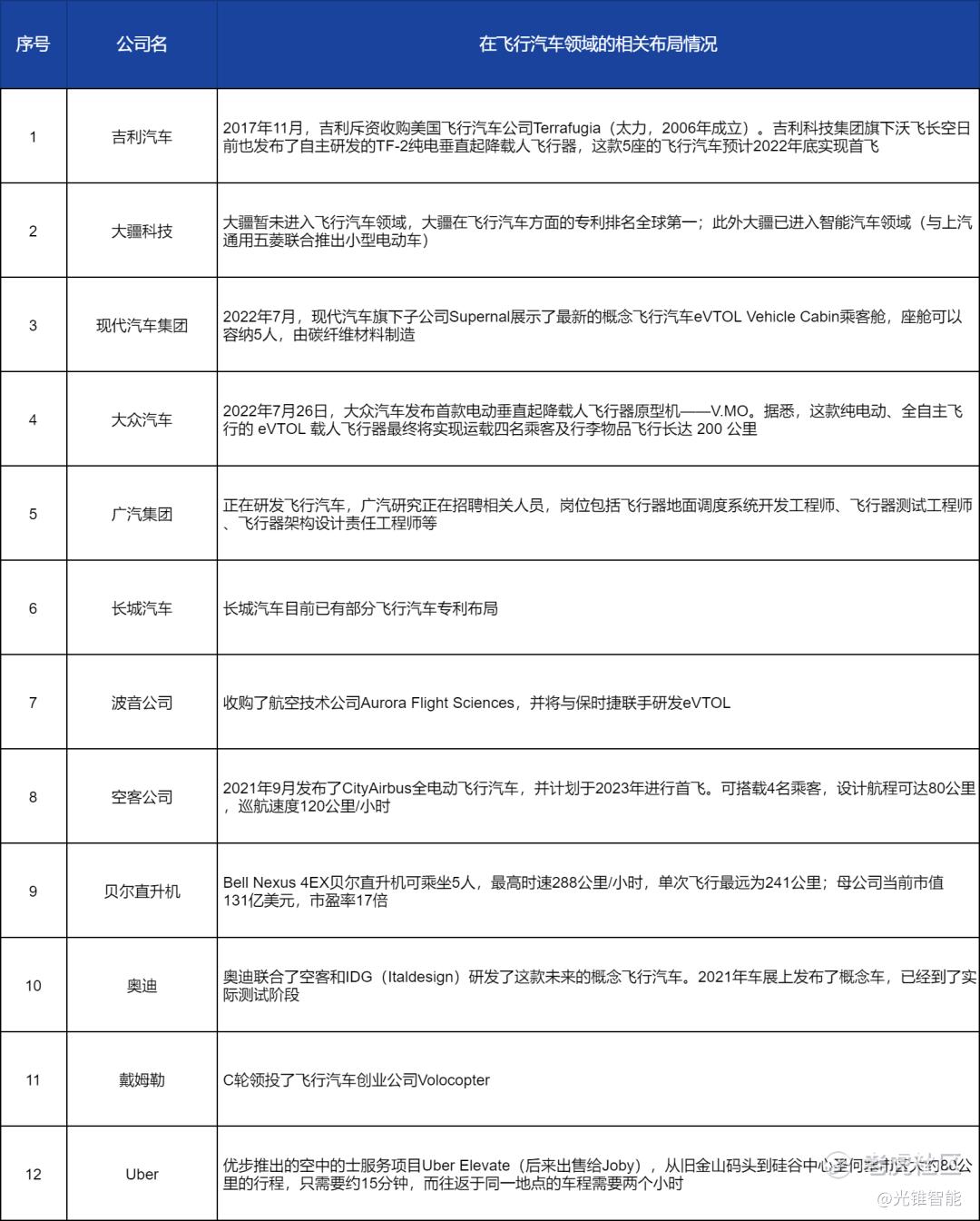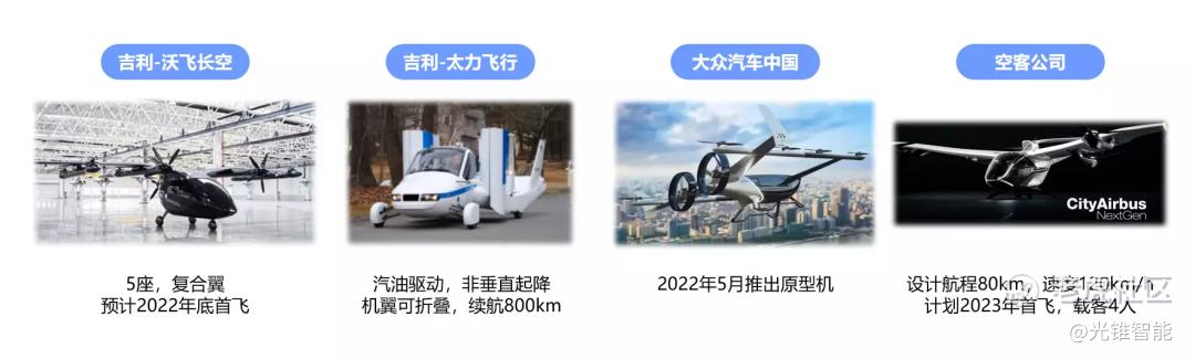 目前国内产业巨头中,量产进展相对领先的是吉利集团,旗下拥有沃飞长空及太力飞行两家公司,在专利布局方面最领先的是大疆科技(虽然并未开始推出相关产品)。