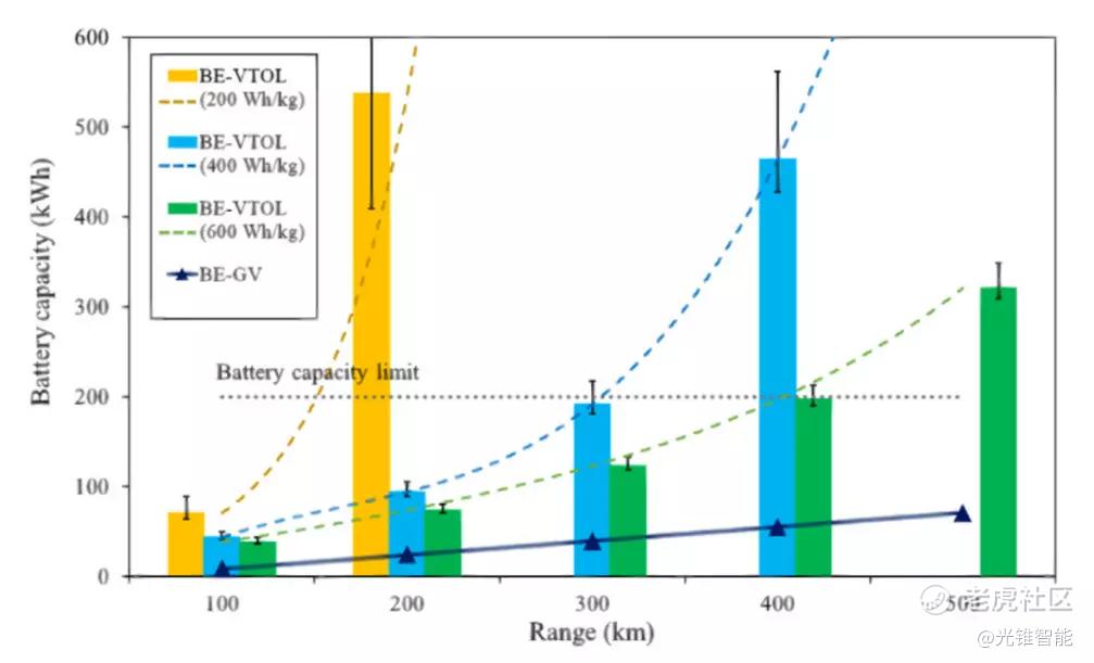 当电池能量密度为200Wh/kg时,飞行汽车续航100km所需电池容量为70kWh,续航200km所需电池容量为537kWh(按照每度电5kg的重量,续航200km需要2.5吨电池,因此不现实)。