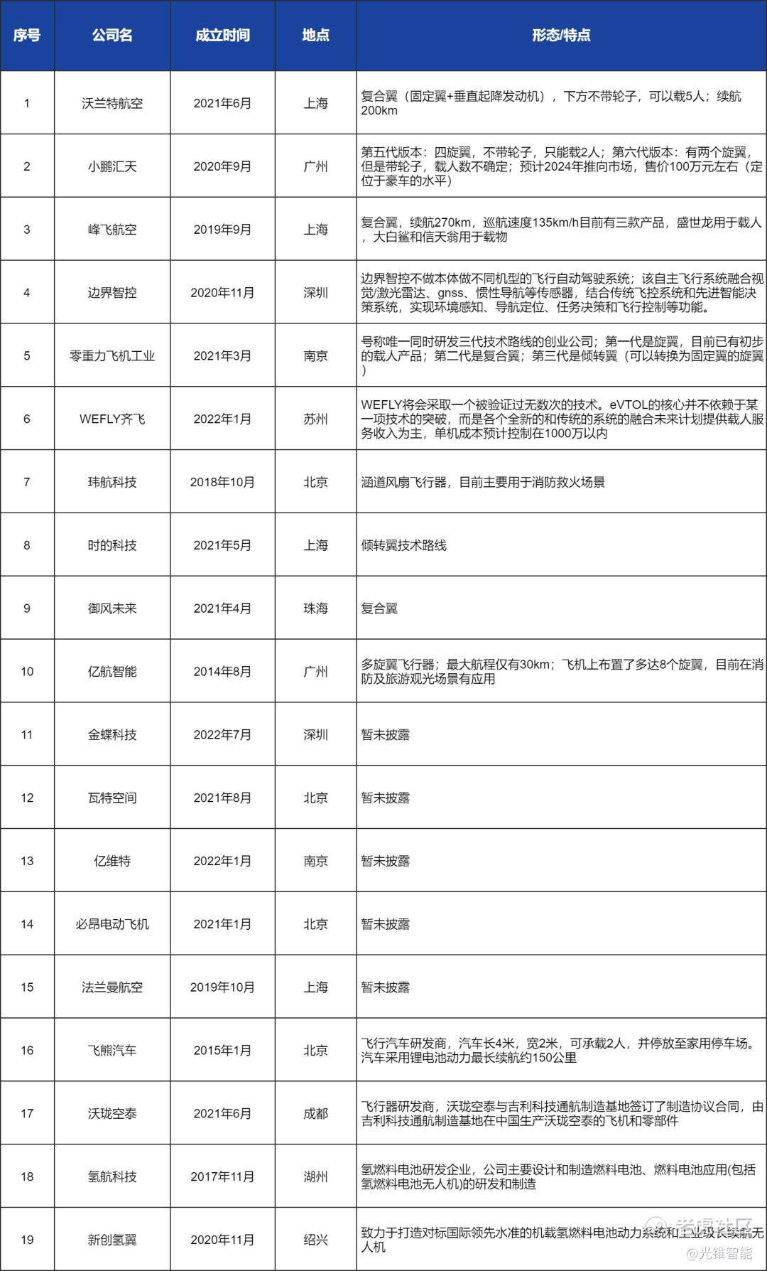 国内值得关注的创新公司有:沃兰特航空(复合翼)、零重力飞机工业(倾旋翼方案,同时有前两款技术积累)、时的科技(倾旋翼)、WEFLY齐飞等。