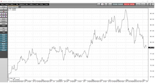 上图显示了11月14日该比率降至80:1的水平,这是白银和黄金的看涨信号。