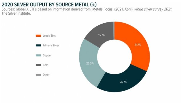 每年白银产量的大部分来自铜、铅、金和其他金属生产的副产品。2020年,不到27%的白银产量来自初级采矿活动。