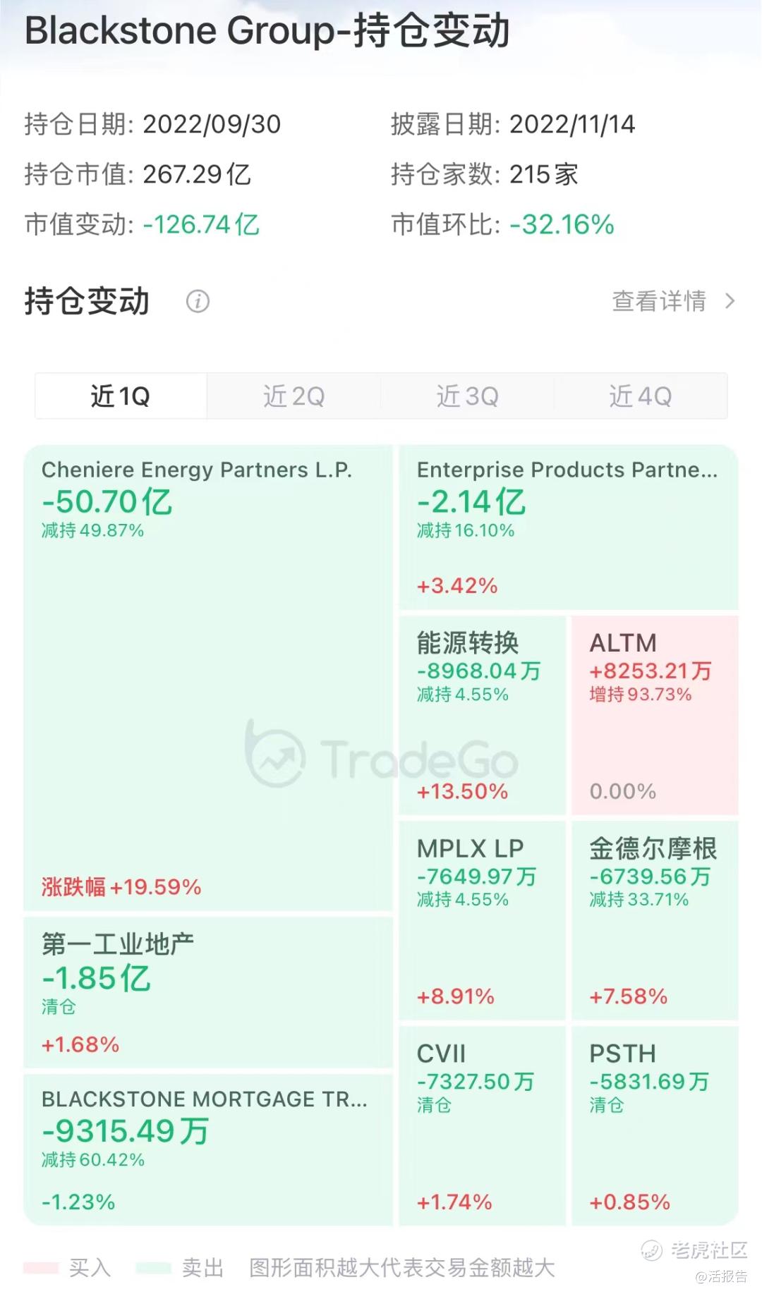 黑石第三季度基本没有大的股票增持,重点减持了美国最大液化天然气出口码头Cheniere Energy Partners以及Enterprise Products,并清仓了第一工业地产。黑石通过减持Cheniere Energy Partners,套现了超过50亿美元。