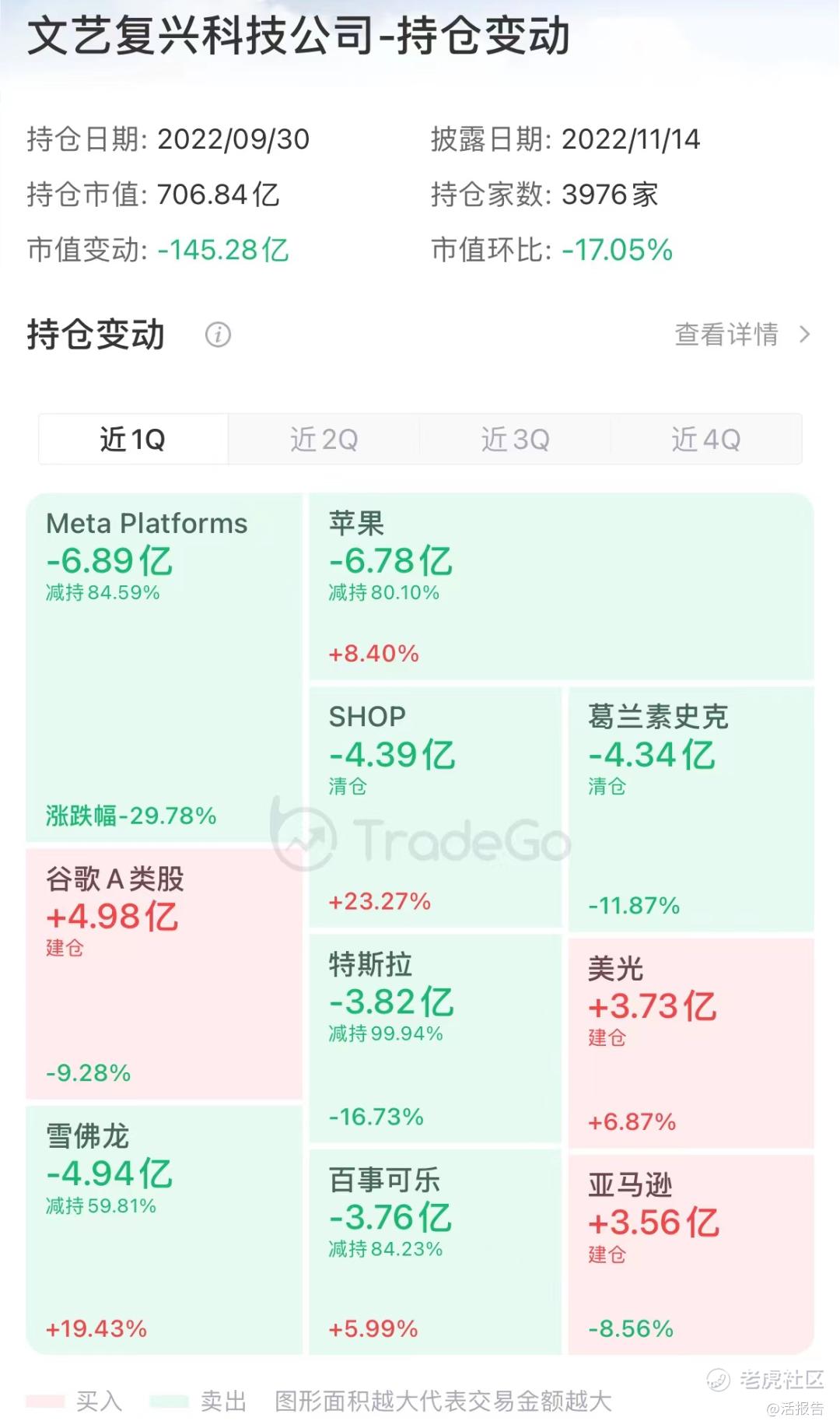 同时,文艺复兴清仓了Shopify (SHOP.US)、葛兰素史克 (GSK.US),并大幅减持了Meta Platforms (META.US)、苹果 (AAPL.US)、雪佛龙 (CVX)、特斯拉(TSLA.US)、百事可乐(KO.US)、伯克希尔哈撒韦-B (BRK.B.US)、Workday (WDAY.US)、动视暴雪 (ATVI.US)等标的。