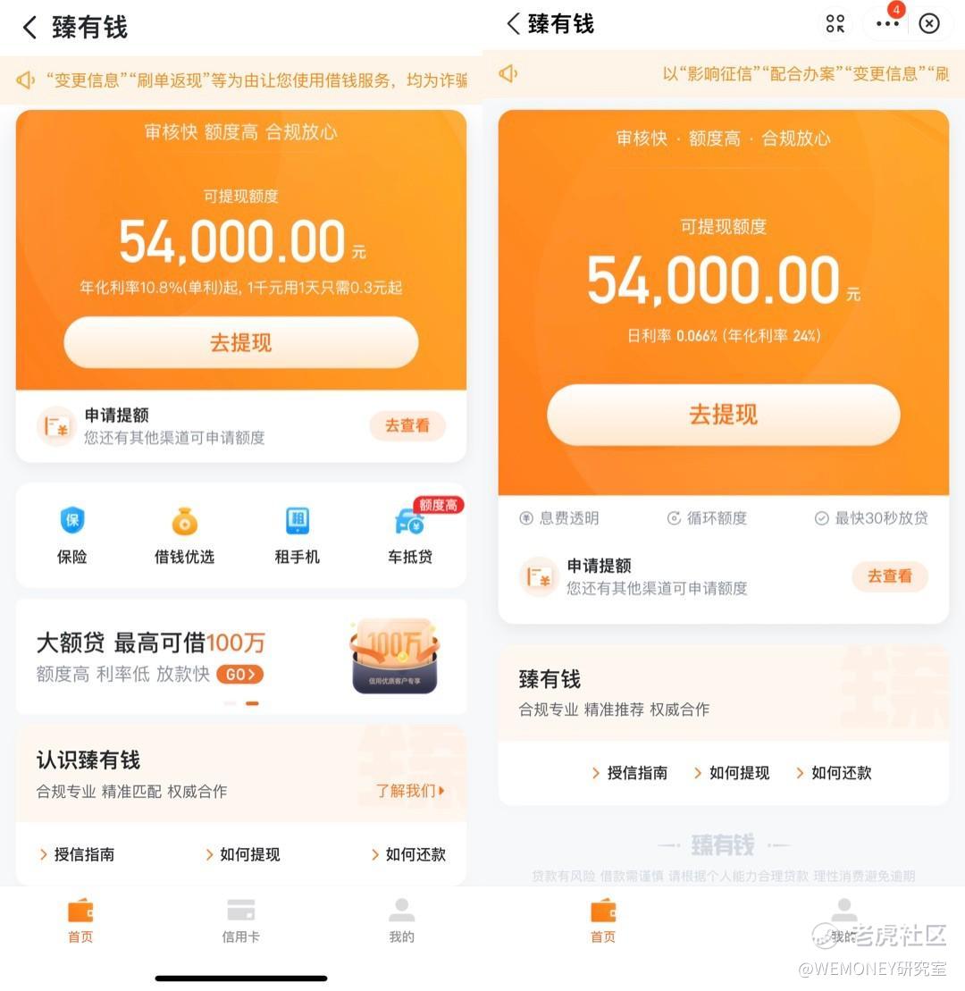 WEMONEY研究室发现臻有钱在初始的借款页面宣传的是低息(利率10.8%起),但在实际的借款页面却展示为真正的年化利率(24%)。这一小小的变动,让包括张先生在内的用户认为,臻有钱通过低息为宣传噱头,诱导用户认证获取额度,有不熟悉金融产品的用户,在实际借款时容易忽略真正的借款利率。多位用户认为哈啰这样的宣传设置会促成最终借款。