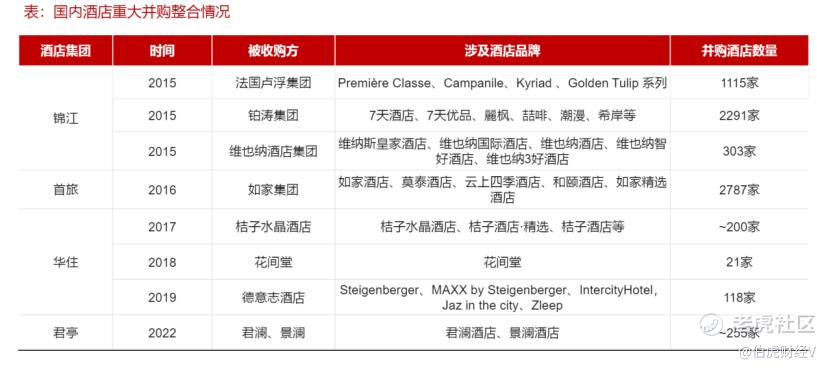2015年以来,国内酒店市场并购提速,锦江、华住、首旅等酒店集团通过并购快速提高集团的市场份额,同时通过并购优质品牌,打造了多元的品牌矩阵,完善公司酒店产品的价格带。疫情爆发后,单体酒店大幅出清,酒店集团凭借"钞能力"迎来提升市场份额的历史性机遇。锦江、首旅、华住拓店数量均超过疫情之前水平。