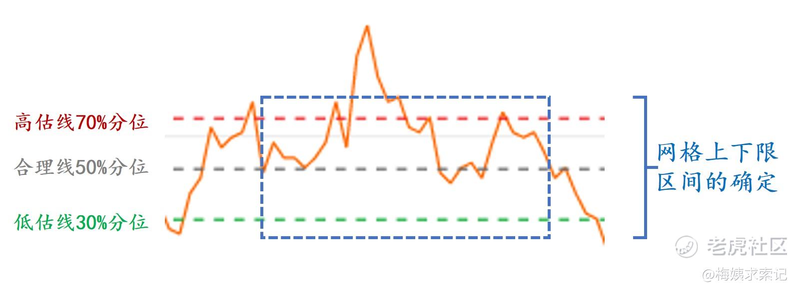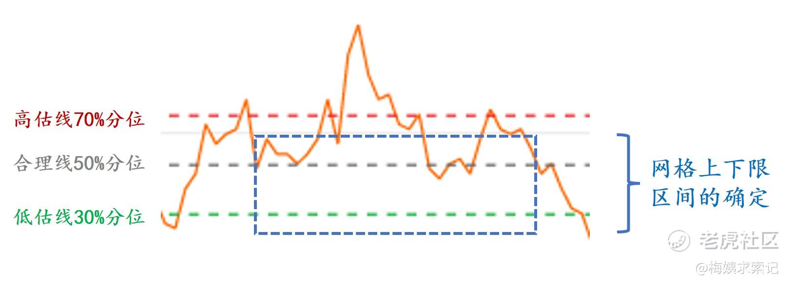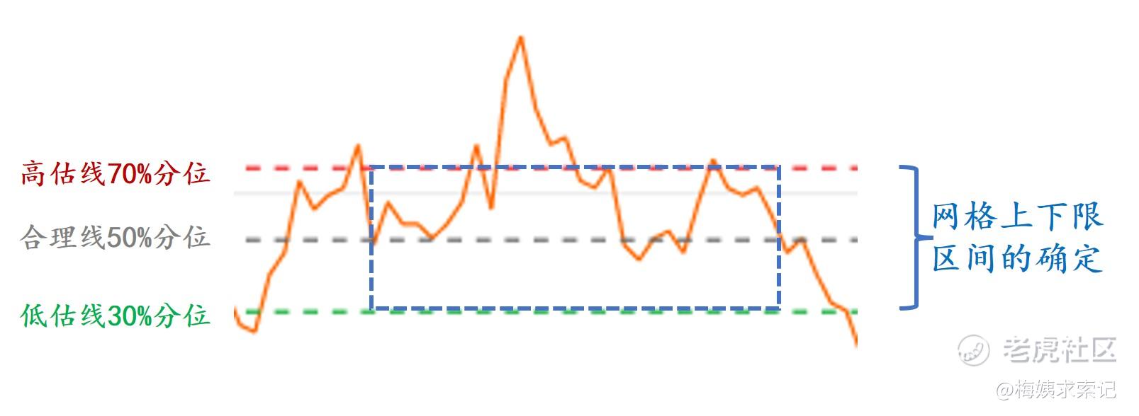 你看,这就是一种根据估值确定网格上下限的方法。把网格上限设置在高估线附近,把网格下限设置在低估线附近。而且,至少要使网格中枢/网格基准落在合理估值以下。