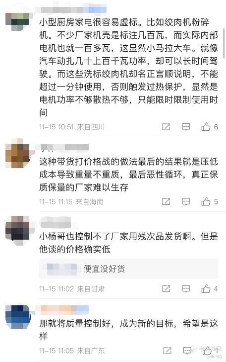 另外,11月13日,知名打假人王海发布视频表示,小杨哥直播间售卖的金正破壁机和绞肉机均为虚标功率。其中,破壁机标注功率为300W,实际仅为105W,而绞肉机标注功率300W,实际功率只有120W。