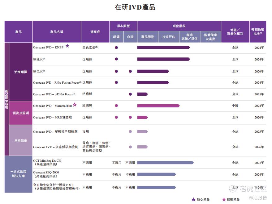 根据弗若斯特沙利文的资料,公司的核心产品Genecast IVD – KNBP是第一款在中国商业化的仅用于结直肠癌的NGS伴随诊断试剂盒,也是全球第二款此类试剂盒。公司已于2021年2月从国家药监局获得了公司核心产品结直肠癌适应症的第三类医疗器械注册证书,并于2021年3月开始该产品的商业化。公司的核心产品于2022年3月获得CE认证。公司正在该产品的适应症扩展的研发阶段。截至最后实际可行日期,公司已启动国家药监局要求的临床试验,以扩展Genecast IVD–KNBP的适应症,用于黑色素瘤的治疗选择检测,并预计于2023年第三季度完成临床试验。
