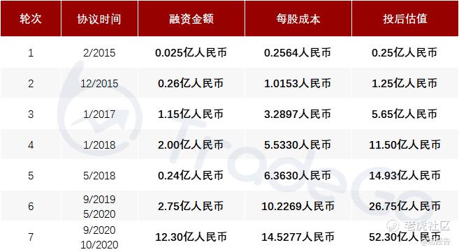 公司共经历过7轮融资,最后一轮E轮融资的投后估值为52.3亿元人民币。公司的知名投资者包括正心谷资本、经纬创投、中金资本、高瓴、康泰人寿等等。