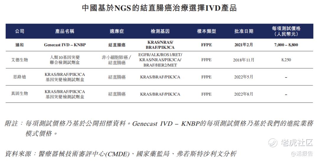 根据弗若斯特沙利文的资料,截至最后实际可行日期,公司的Genecast IVD – KNBP是中国获国家药监局批准可商业销售的17款基于NGS的治疗选择IVD产品之一。在中国获国家药监局批准可商业销售的16款其他基于NGS的治疗选择IVD产品中,两款产品仅用于结直肠癌适应症、一款产品用于结直肠癌及非小细胞肺癌适应症,一款产品仅用于上皮性卵巢癌(「EOC」)适应症,以及12款产品仅用于非小细胞肺癌适应症。自2018年7月至2022年8月,该等16款其他基于NGS的治疗选择IVD产品获国家药监局批准,每项检测定价介乎人民币3,400元至人民币8,250元之间。