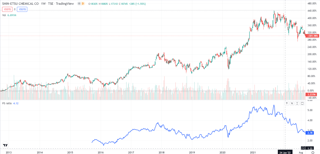 因为经济衰退预期加剧和美元加息升值是近期的事,即使展望全年,公司提供的业绩指引仍然是在2021年的基础上利润提升10%。得益于半导体行业对材料的需求依然景气,而PVC行业全球的价格平稳,等待触底回升,所以公司对于未来仍有一定信心。总而言之,这一年里,信越化学的估值是降了不少,但业绩依然在正增长的轨道中。到今年底,信越化学的PE很可能将降至10倍以下。