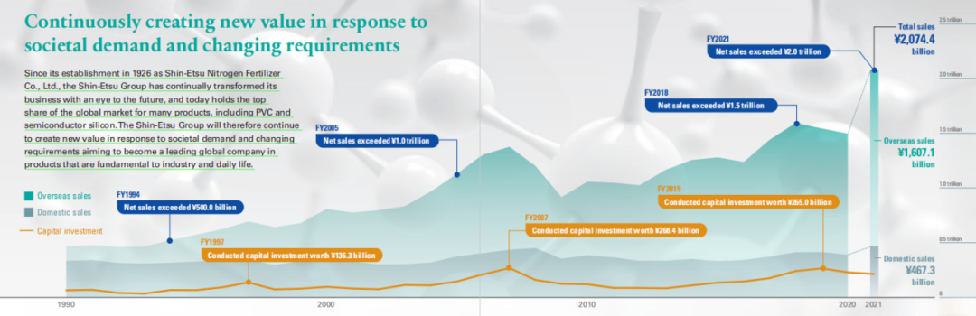 从历史的角度看,信越化学实现了长期可持续的成长。从90年代起,其国内销售额跟随日本经济停滞不前,但其海外销售额节节攀升,从90年代开始的几百亿日元增长至如今的1.6万亿日元。截止目前,公司的收入70%都来自于非日本本土。