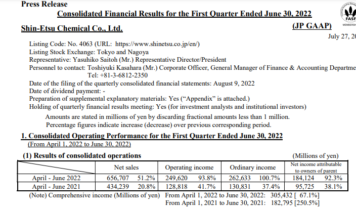 最后回到公司短期的业绩和估值上面,尽管现在PVC和芯片行业都处于周期向下的阶段,但信越化学最新一个季度的业绩仍然亮眼,公司收入同比增长超过50%,而经营利润更是翻倍。