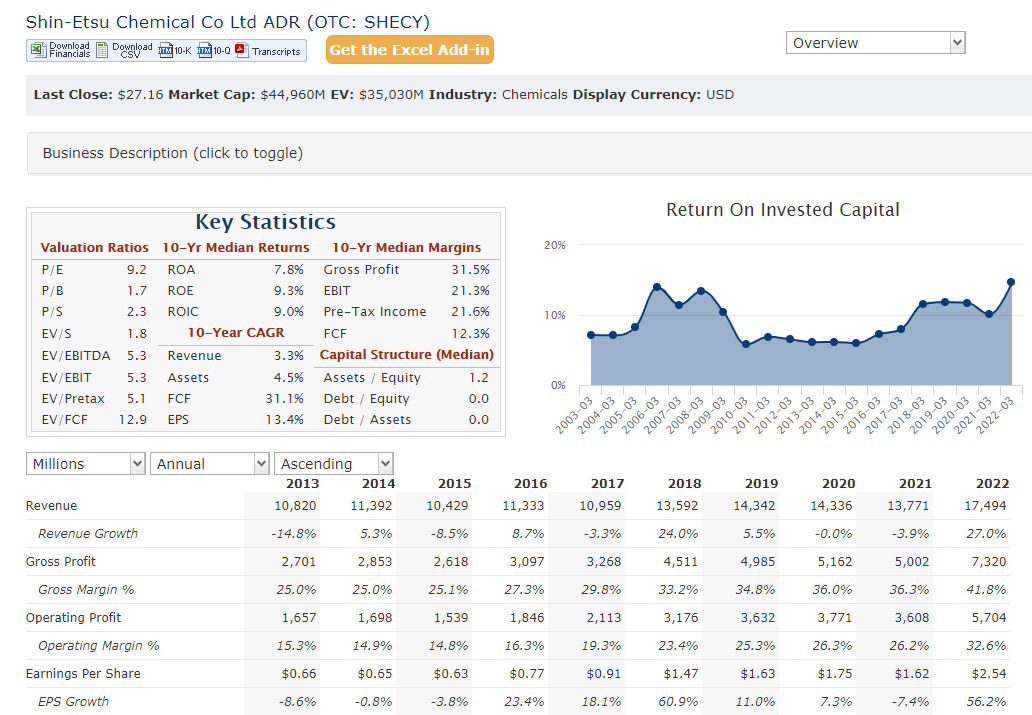因此在资本市场表现方面,也算是日本市场里少有的明星股了,10年间涨了近4倍,还是在今年以来下跌了22%的表现,所以说,信越化学算得上是一个亮眼的日本核心资产。