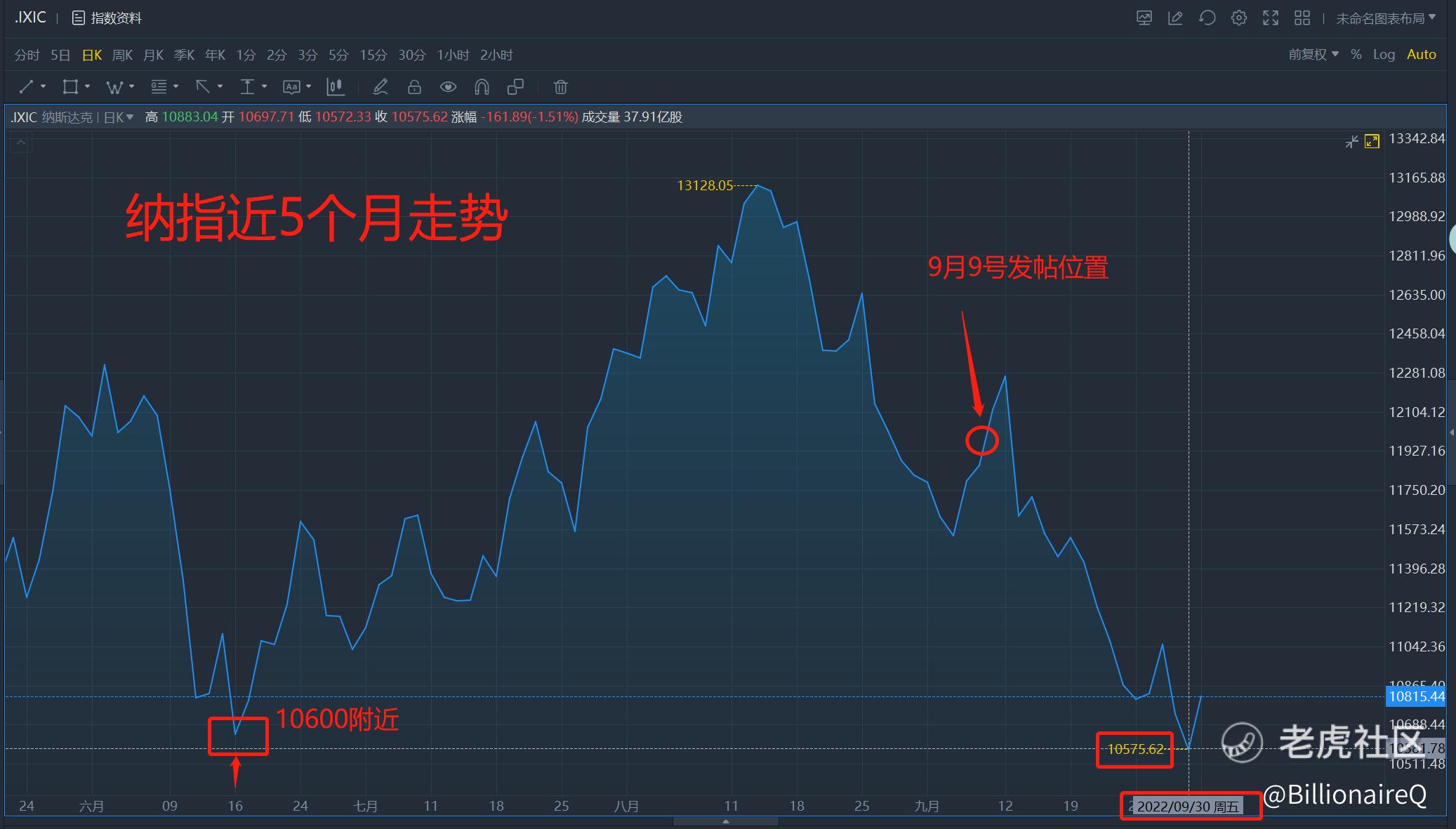 截止9月30号,大盘也基本按原预测到了该到的位置,10600附近(6月时的底部),如下图