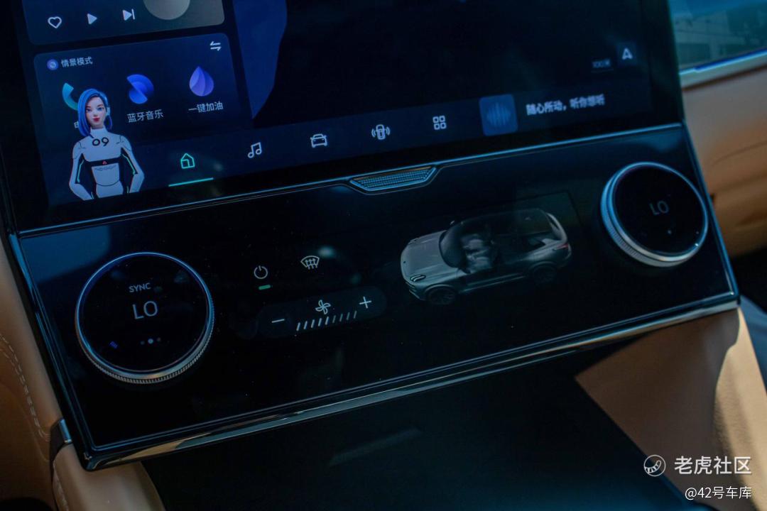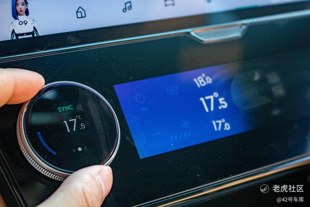 12 英寸大屏的下方还有一块 6 英寸的小屏,在这里控制空调温度、风量和风向。这块屏幕的旋钮上也有液晶显示屏,显示效果细腻,还可以左右滑动控制多个功能,操作逻辑有点类似智能手表。