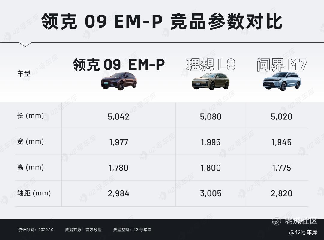 作为领克品牌的旗舰产品,领克 09 EM-P 在设计上也要有旗舰的风范。在外形尺寸上,领克 09 EM-P 介于理想 L8 和问界 M7 之间: