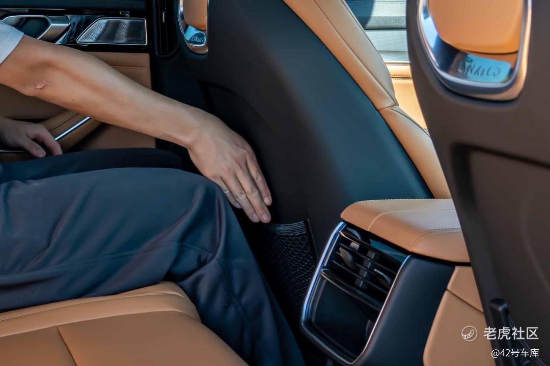 大家最关心的肯定就是 2、3 排的乘坐体验了。在座椅舒适性上,后排相比前排更加柔软。在肩膀部位还特别设计了厚实的包裹,背部和臀部也做了打孔设计。伸缩式杯架采用钢琴烤漆,手肘触碰的区域同样是厚厚的皮质包裹。