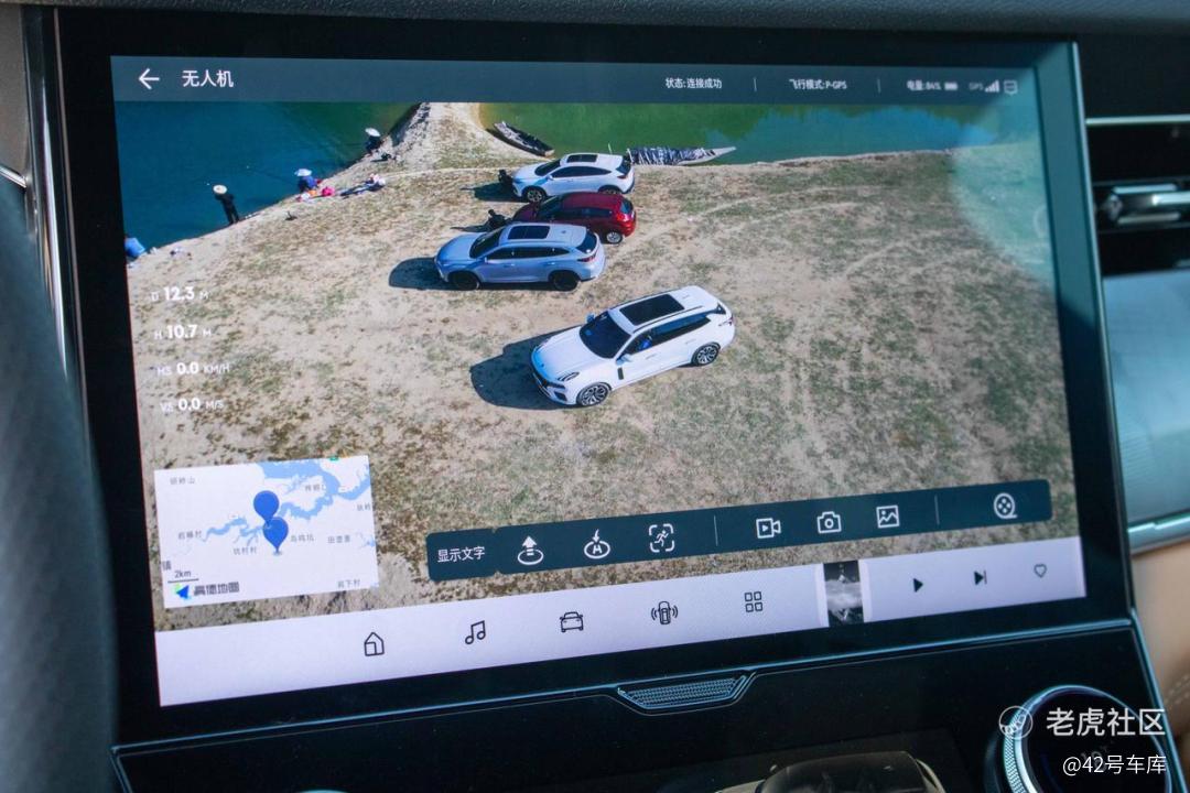 一个非常有意思的功能:领克 09 EM-P 的车机竟然可以连接和控制大疆的无人机。将遥控器用数据线连接到扶手箱内的接口,你就可以可以在车控界面上控制无人机的起落。同时,你也可以选择「跟随模式」,这个功能堪称自驾游拍摄好帮手。