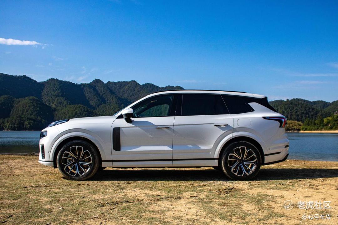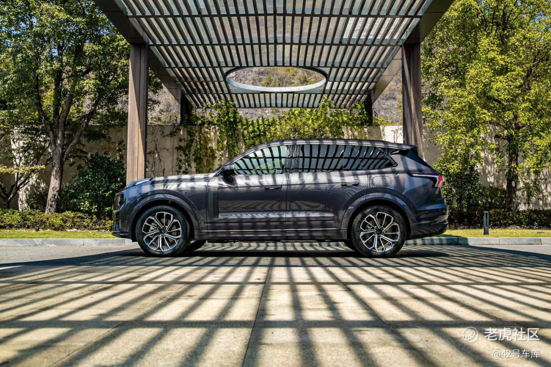 领克 09 EM-P 的侧面是我认为最好看的角度。先从整体来看,五米多的车长给了设计师足够的空间:复杂的车侧曲面线条和从翼子板拉向后门的线条、尾部飞扬的筋线、底部贯穿的黑色装饰以及车身同色的轮眉,这些元素将一台中大型 SUV 的修长、豪华和力量感营造的非常出色。