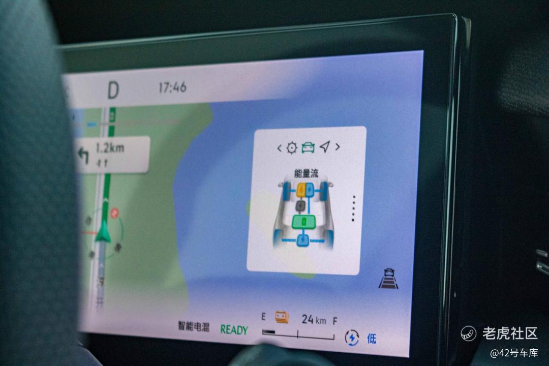 先聊聊日常驾驶时的动力表现。在「智能模式」下,系统也将根据导航信息对用户整个行程中各路段能耗进行预测和管理能量:电量充足则纯电优先;电量不足则在拥堵路段前提前充电,保持低时速纯电行驶。