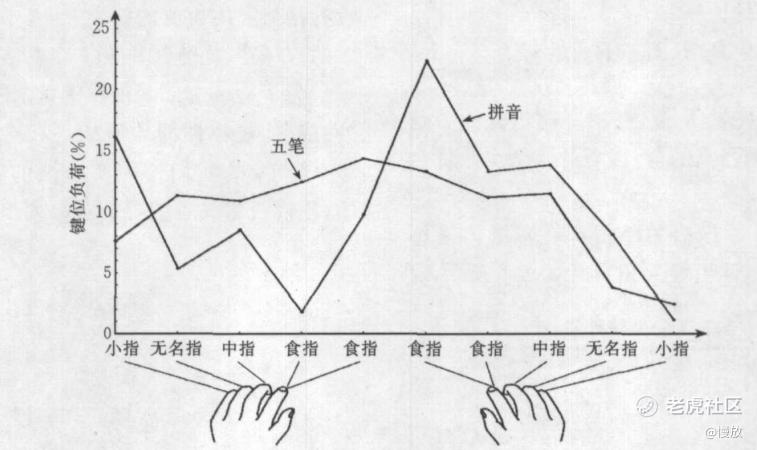▲王永民统计的每根手指打五笔和打拼音击键概率图