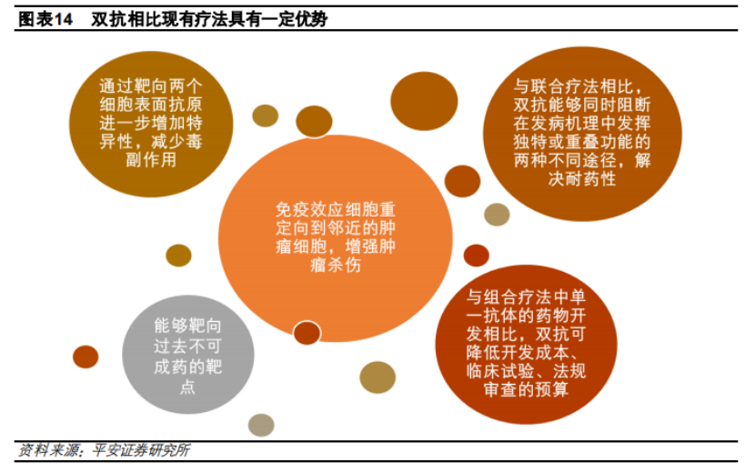 但是,相较于单抗,由于双抗是将两个靶点识别区域结合在一个抗体上,能产生单抗或联用所不具备的新的药物机制,靶点间的协同效应更强,既提升了药物的靶向特异性以及肿瘤杀伤作用,也减少了毒副作用并解决耐药性的问题。