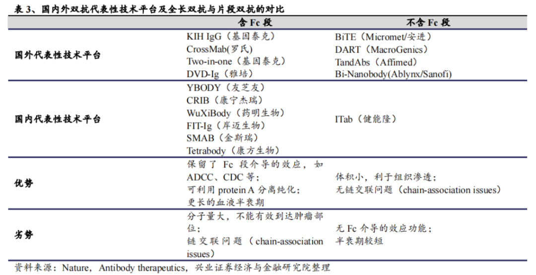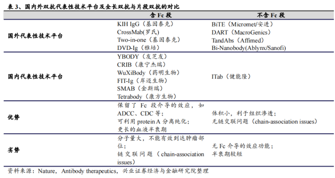 目前,国内具有代表性技术平台,包括康宁杰瑞的CRIB、岸迈生物的FIT-Ig、康方生物的Tetrabody等,共同点都是含Fc段的双抗(全长双抗),优势在于保留了Fc段介导的效应,如ADCC、CDC等;可利用protein A分离纯化;更长的血液半衰期。