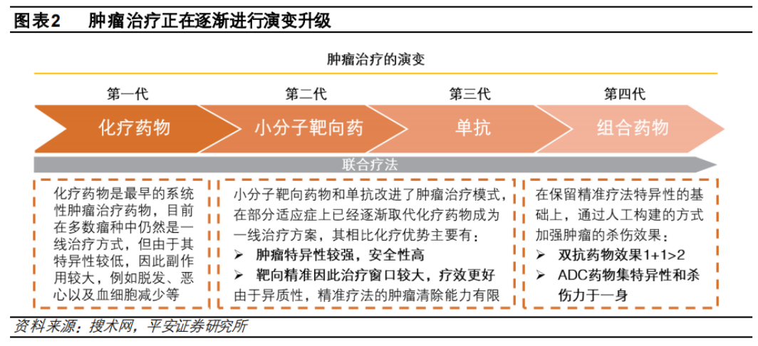 从小分子靶向药到单抗,再到药物效果“1+1>2”的双抗,乃至被奉为前沿技术的组合药物ADC,不仅诠释了肿瘤治疗的演变,而且趋向于不同治疗方法之间的联合应用。