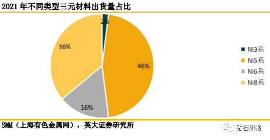 Ni元素比例在60%及以上的称为高镍三元材料。高镍化三元将持续成长为长续航车型的主流技术,随着相关技术发展以及整车平台功能整合,未来新能源汽车将持续向更高能量密度、更长续航里程发展,高镍化三元锂电池的发展趋势愈加明显。根据SMM上海有色金属网数据,2021年国内三元正极材料仍以高电压Ni5系产品为主,占比46%,其次为Ni8系高镍产品,占比为36%,Ni6系产品占比为16%。