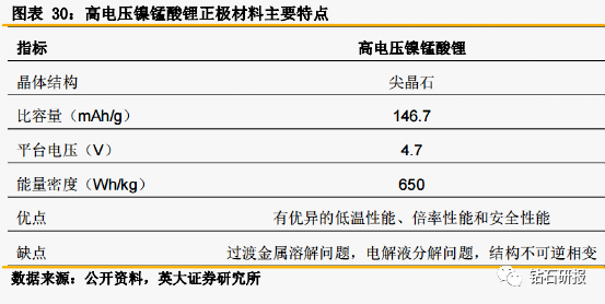 高电压镍锰酸锂:其平台电压约为4.7V(负级为锂),比磷酸铁锂高约40%,比三元材料高约25%,理论比容量为146.7 mAh/g,可逆比容量可达140 mAh/g,能量密度达650 Wh/kg。并且它不含钴,主要是锰和镍,且镍的含量也较低,具有低成本的优势。高电压镍锰酸锂三维的锂离子通道和稳固的尖晶石结构,使其具有优异的低温性能、倍率性能和安全性能,可满足动力电池快速充放电和全气候使用条件的要求。在锂资源利用率方面,镍锰酸锂在充电态锂离子几乎完全脱出,锂离子利用率接近100%,以其取代目前动力市场上应用的第二代的磷酸铁锂和三元动力电池将为全球分别节省30%和50%的锂资源。因此镍锰酸锂是理想的下一代安全、低成本、高比能量的动力电池正极材料。