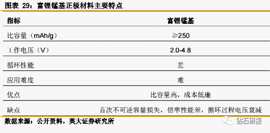 富锂锰基正极材料:其具有能量密度高、成本低和环境友好等特点,是未来可能的一种正极材料发展方向,其比容量高达300mAh/g,远高于当前商业化应用磷酸铁锂和三元材料等正极材料放电比容量,是动力锂电池能量密度突破400Wh/kg的技术关键。同时富锂锰基材料以较便宜的锰元素为主,贵重金属含量少,与常用的钴酸锂和镍钴锰三元系正极材料相比,不仅成本更低,而且安全性更好。