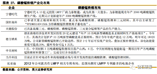 动力电池企业方面,目前拥有磷酸锰铁锂技术储备的电池厂商包括:宁德时代、比亚迪、国轩高科等,主要以专利技术研发、投资布局为主。宁德时代、欣旺达及亿纬锂能的磷酸锰铁锂电池已在今年上半年通过电池中试环节,正在送样品给车企测试。宁德时代计划于今年下半年量产该产品。当下已在磷酸锰铁锂有所布局的正极厂商包括:德方纳米、鹏欣资源、当升科技、中贝新材料、天津斯特兰等。
