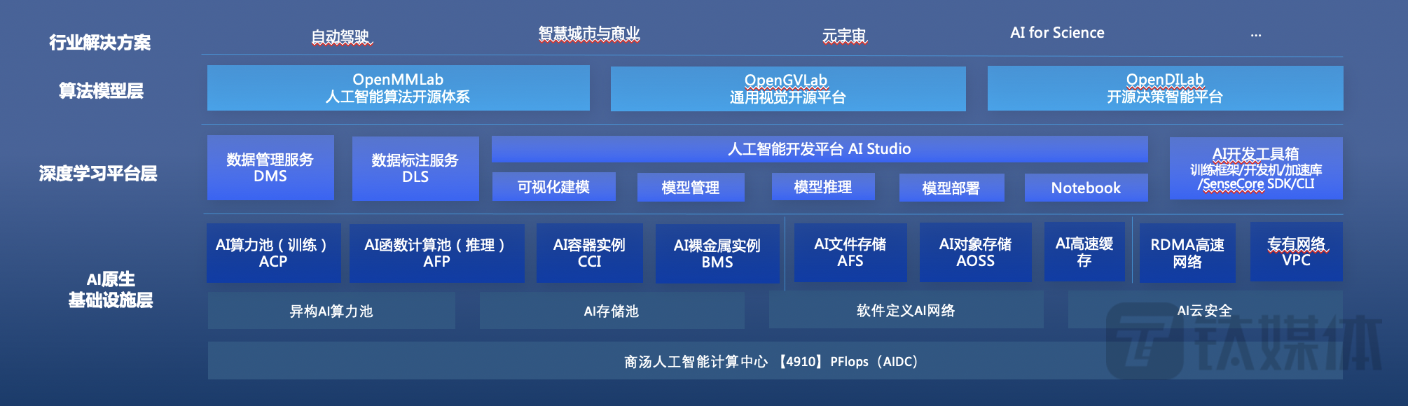 据悉,商汤 AI 云计算产品架构包括提供 AI 原生基础设施层(AI IaaS)、深度学习平台层(AI PaaS)、算法模型层能力,以及自动驾驶、智慧城市、AI for Science(科学计算创新)、元宇宙等多个行业解决方案。