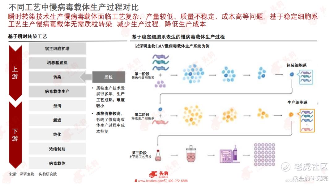 国内企业中,深研生物的慢病毒生产技术基于稳定细胞系工艺,而蓬勃生物的慢病毒载体生产基于瞬时转染工艺。通过瞬时转染技术生产慢病毒载体的应用发展较早,但是基于成本和产量的考虑,慢病毒载体生产服务商也正不断探索通过稳定细胞系生产慢病毒载体并商业化的方式。