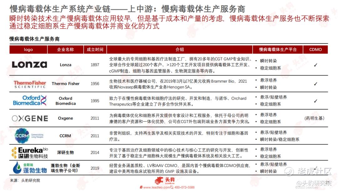 目前行业中较为突出的慢病毒载体生产服务商有国外的Lonza、Thermo Fisher、Oxford Biomedica、Oxgene(被药明生基收购)、CCRM,国内的深研生物、蓬勃生物等企业。