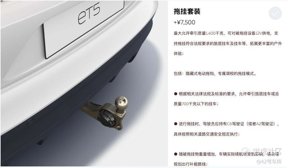 最后,ET5 还支持选装和 ES7 类似的拖挂功能。不过由于 ET5 是轿车,所以并不能像 ES7 一样拖挂质量 2,000 千克的车辆,但最高也可以拖挂 1,400 千克的车辆,对于喜欢运动轿车又喜欢在户外露营的车主算是一个新的选择。